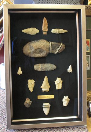 A great collection of Arrowheads and Axes sewn into the shadow box with twine and rope