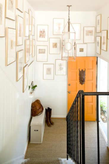 Carefully cut the pages out of your book, then add a mat and frame to it and – tada! Gorgeous. Local interior designer Lauren Liess did this in her home – The entryway is hung with Leonardo da Vinci sketches taken from a book. The gold frames help unify the arrangement: