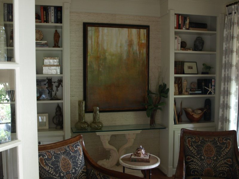 Most designers (not all) start planning a room from the ground up. They pick out the carpet, then the wall color, then the furniture, the textiles, and then the art. Lisa has worked with lots of designers who bring her their space’s “game plan” including the – pillows, wall colors, textures in the room and give her an approximate size they need. Commissioned work gives the client the right size, scale, colors, values and imagery for the space. The designers can suggest a style they wish the piece to look like – for example, one client wanted a painting that was reminiscent of Rothko. The designer or homeowner then trusts Lisa’s natural artistic ability to do the rest. Here is an example of a room where the art flows perfectly with the textiles and really ties the space together:
