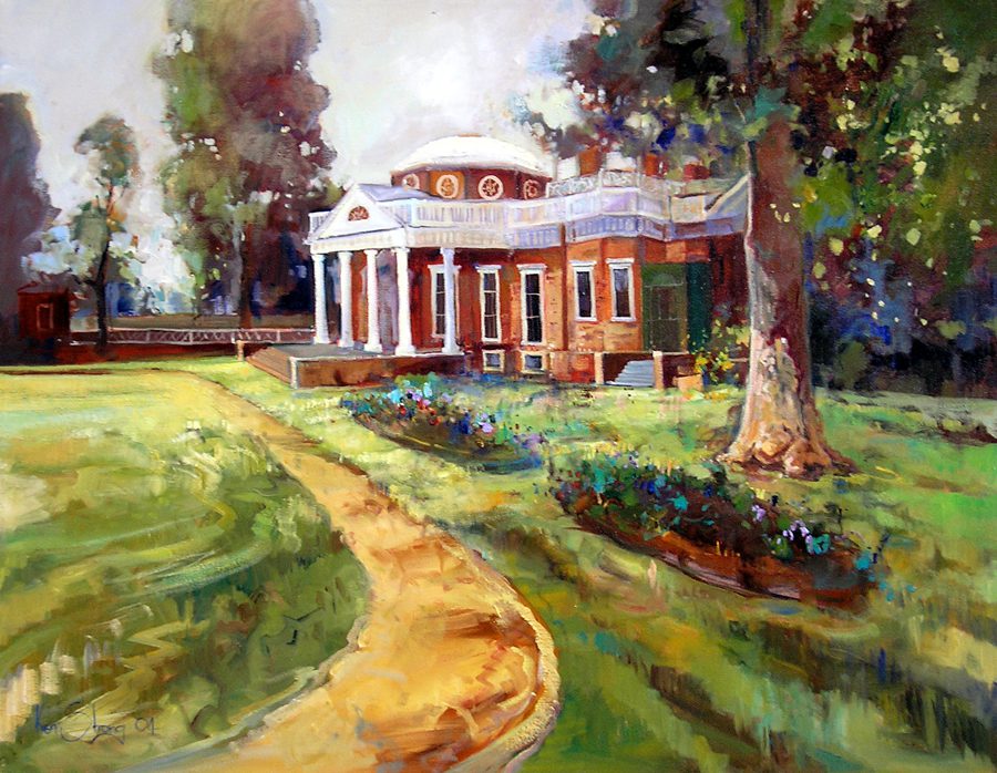 Ken Strong’s style is characterized by a bold application of paint with a focus on landscapes. Many of his pieces include compositions from some of our country’s travelled historical sites, like Harpers Ferry and Monticello, as seen here.