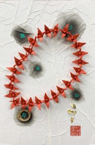 Hiromi Ashlin, an internationally known Japanese origami master, seamlessly creates natural, Zen-eques designs through the repetition of pattern and movement of thousands of origami pieces per work. Her use of Japanese washi paper creates an inviting texture and depth to her pieces, inviting the viewer in to explore each crease and fold.